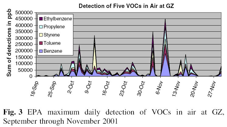 Another point to remember is that the evaporation doesn’t happen in a pouf!  Chemicals evaporate over time – sometimes over quite long periods of time.  The graph below is of various evaporating chemicals at ground zero (GZ)  of the World Trade Center after the September 11 attacks: