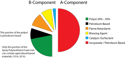 It reduces our dependence on fossil fuels: This means that while suppliers may claim that ‘bio foams’ are based on renewable materials such as soy, in reality a whopping 90 to 95%, and sometimes more of the product consists of the same old petro-chemical based brew of toxic chemicals. This is no ‘leap forward in foam technology’. In the graphic below, “B-Component” represents the polyol portion of polyurethane, and the “A-Component” represents the isocyanate portion of the polyurethane: