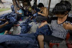 Sewing Jeans These workers are sewing jeans in a makeshift shed that serves as a workshop in Xintang 2010 08/12/2010 © Qiu Bo / Greenpeace