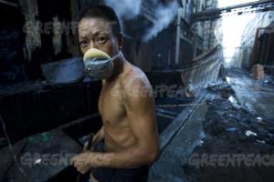 Worker in GuangDong Every morning, workers at a denim washing factory must search through wastewater to scoop out stones that are washed with the fabric in industrial washing machines to make stonewash denim. Xintang, 08/14/2010 © Qiu Bo / Greenpeace