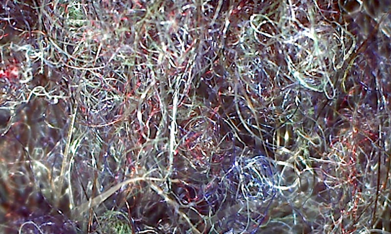 A magnified image of clothing microfibres from washing machine effluent. One study found that a fleece jacket can shed as many as 250,000 fibres per wash. Photograph: Courtesy of Rozalia Project