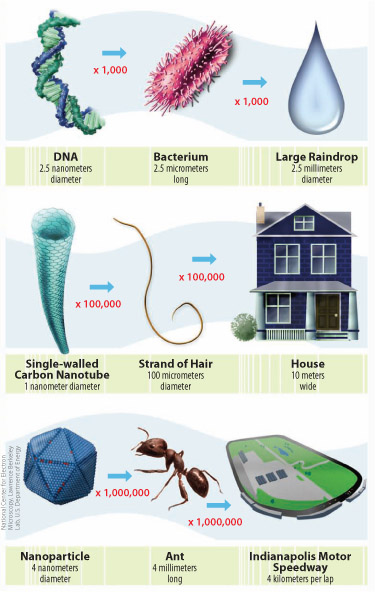 It seems the better term is really nanoscience. Nanoscience is the study of things that are really really small: A nanometer is one billionth of a meter (10-9 m). This is roughly ten times the size of an individual atom. For comparison, 10 NM is 1000 times smaller than the diameter of a human hair. How small is that? “If a centimeter is represented by a football field, a nanometer would be the width of a human hair lying on the field,” offers William Hofmeister of the University of Tennessee Space Institute’s Center for Laser Applications.