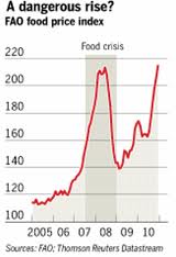 And the price of our food keeps going up: In early January, 2011, the U.N. Food and Agriculture Organization (FAO) reported that its Food Price Index had reached an all-time high in December, exceeding the previous record set during the 2007-08 price surge. Even more alarming, The FAO announced later that the December record had been broken in January as prices climbed an additional 3 percent – then in February they reached the highest level ever recorded.[4]