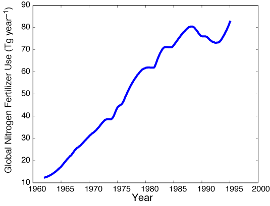 The basis of the Green Revolution is the belief that technology increases output. But while agricultural output increased dramatically as a result of the Green Revolution, the energy input to produce a crop increased even faster[4]. The Green Revolution has increased energy inputs in agriculture to levels around 50 times those of traditional agriculture[5]. To give you an idea of how energy intensive modern agriculture has become, to produce one kilogram of nitrogen for fertilizer requires the energy equivalent of 1.4 to 1.8 liters of diesel fuel. This equates to the energy content of 15.3 billion liters of diesel fuel, or 96.2 million barrels.(6)
