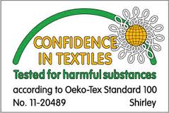 The Oeko-Tex Standard 100 standard is concerned primarily with health and safety of textile products – it tests only the end product. The processing is not addressed – for example, wastewater treatment is not included. It is NOT an organic certification and products bearing this mark are not necessarily made from organically grown fibers. (Note: When you see the logo, make sure that the test number is quoted (No. 11-20489 in the image above) and the test institute is named (Shirley is the institute which tested the product).)